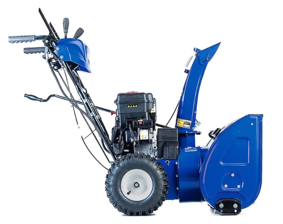 - Металлический желоб выброса с системой быстрого разворота дает возможность просто и моментально менять направление выброса снега на 190 градусов при помощи рукоятки