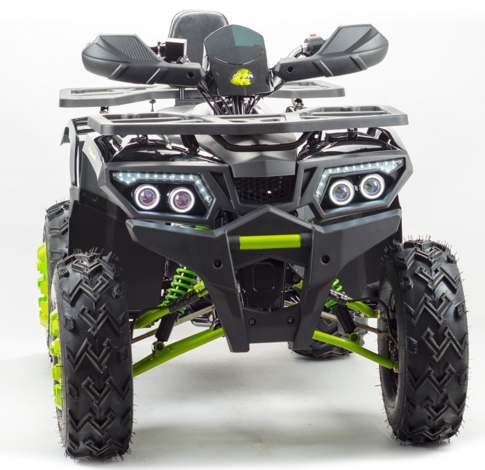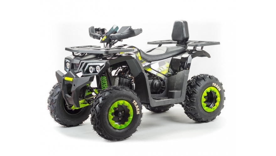 Квадроцикл оснащен 161 QMK на 200 см3 двигателем c воздушно-масляным охлаждением и автоматической коробкой передач с реверсом, дисковыми тормозами, линзованными фарами с диодными ДХО, панелью приборов, ручным стартером. Он отлично подойдет для семейных покатушек, а также для рыбалки и охоты.