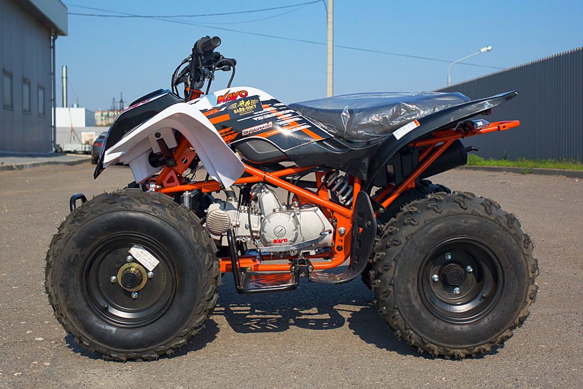 Kayo Storm – это детский спортивный квадроцикл, оснащенный 150-кубовым мотором. Учитывая мощность и габариты техники, данная модель подойдет для подростков. Станет отличным вариантом для обучения езде на мототехнике. Несомненным плюсом станет яркий спортивный дизайн, который точно не оставит вашего ребенка равнодушным. Также подойдет для взрослых, которые любят активный отдых и покатушки по бездорожью.Квадроцикл построен на стальной трубчатой раме, что позволило сделать конструкцию прочной и легкой. Спереди используется рычажная подвеска, а сзади расположился нерегулируемый амортизатор. Колеса стальные с внедорожной резиной. Такой набор гарантирует хорошую проходимость и комфорт во время внедорожных поездок.