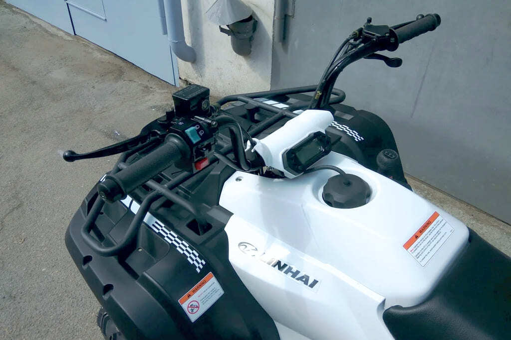 Панель управления выполнена в стандартном дизайне для квадроциклов - передний и задний тормоз сделаны в виде рычагов и выведены на руль. Слева на рукоятках есть рычаги переключения передними и задними фарами. Есть электронный спидометр и одометр - они установлены в привычном месте, на приборной панели.