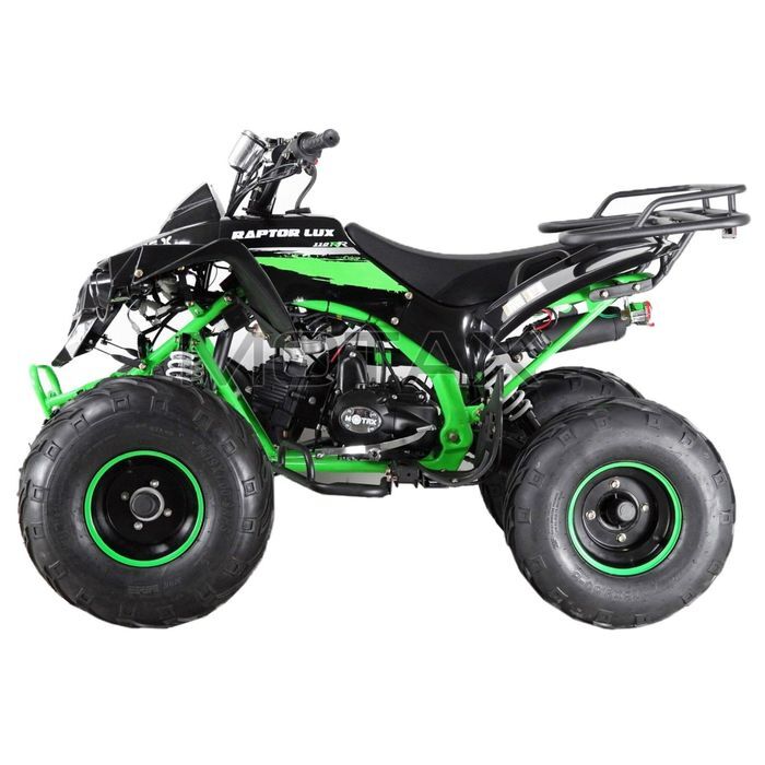 Подростковый квадроцикл MOTAX ATV Raptor-7 предназначен для детей от 8 лет. Он оснащён четырёхтактным одноцилиндровым бензиновым двигателем Zongshen объёмом 125 см³ с воздушным типом охлаждения. Мощность в десять лошадиных сил позволит разгоняться до 60 км/ч. В целях безопасности предусмотрен пульт дистанционного управления с системой родительского контроля и ограничитель скорости до 5–10 км/ч. Специально для улучшенной манёвренности вездеход имеет большие семидюймовые колёса. Установленные амортизаторы с регулировкой жёсткости заметно сглаживают неровные участки дороги.