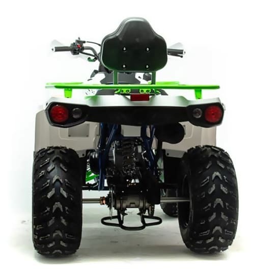 Квадроцикл доступен в белом цвете с модернизированной светодиодной оптикой, ходовыми огнями и поворотниками отлично выглядит в своем новом агрессивном стиле. Дополнительная спинка пассажира, а так же USB разъем. ATV SHARK 200 весит 160 кг, выдерживает нагрузку до 150 кг. Рама стальная, трубчатая, покрашена в цвет металлик. Прочный облицовочный пластик не ломается при сгибании, герметизированная проводка защищает от грязи. Размер задних колес — 10 дюймов (250-96), переднего — 10 дюйм (180-90), а так же усиленной задней осью. Система зажигания электронная (CDI). У квадроцикла отличный запас хода: объём топливного бака — 10 л, расход топлива — 4/5 л на 100 км. Передние светодиодные фары обновленного дизайна легко включается поворотом замка зажигания и позволяют ездить в сумерках и темноте. Данная модель оснащена 1-поршневыми тормозными суппортами, спереди и сзади. Тормозной шланг армированный. Имеется стояночный тормоз как передних так и задних колес. Есть возможность установить лебедку.