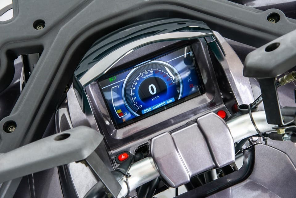 Трансмиссия и ходовая часть квадроцикла представлена прочными разноразмерными шинами, металлическими штампованными колесными дисками, автоматической трансмиссией с реверсом. Модель имеет крупный размер, удобное посадочное место, высокий дорожный просвет (320 мм) и чувствительную тормозную систему. В комплекте идет система автозапуска с дистанционным контролем, которая позволяет завести, заглушить квадроцикл на расстоянии 100 метров. А так же имеется ограничитель скорости, расположенный с правой стороны руля. Стоит принять во внимание и наличие таких опций как: защита рук, удобная широкая и закрытая площадка для ног, расширители колесных арок, передний отбойник, гнездо прикуривателя, спидометр, передние и задние поворотники. Плюс, для любителей зимних прогулок имеется комплект цепей противоскольжения.