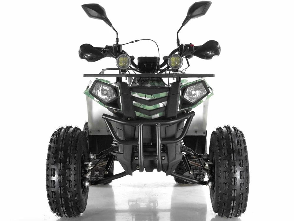 Модель обладает алюминиевыми литыми колесными дисками с песочной резиной. Квадроцикл снабжен ножным тормозом и стояночным тормозом. Система передних и задних гидравлических дисковых тормозов отвечает за безопасную и своевременную остановку во время езды. Независимой рычажной передней и зависимой маятниковой задней подвесками отрабатываются неровности во время движения.