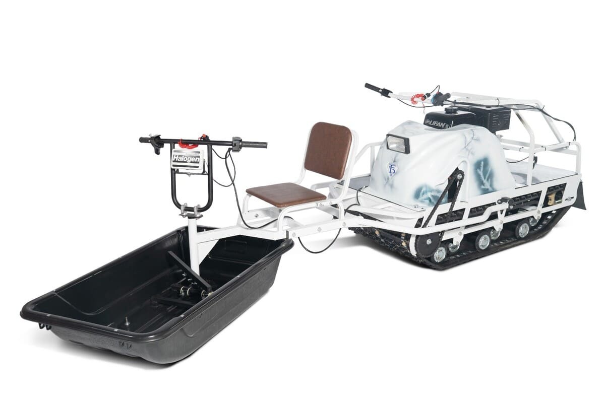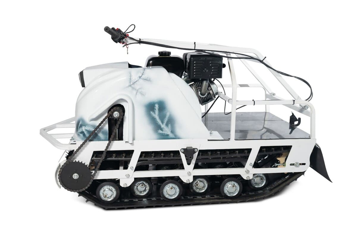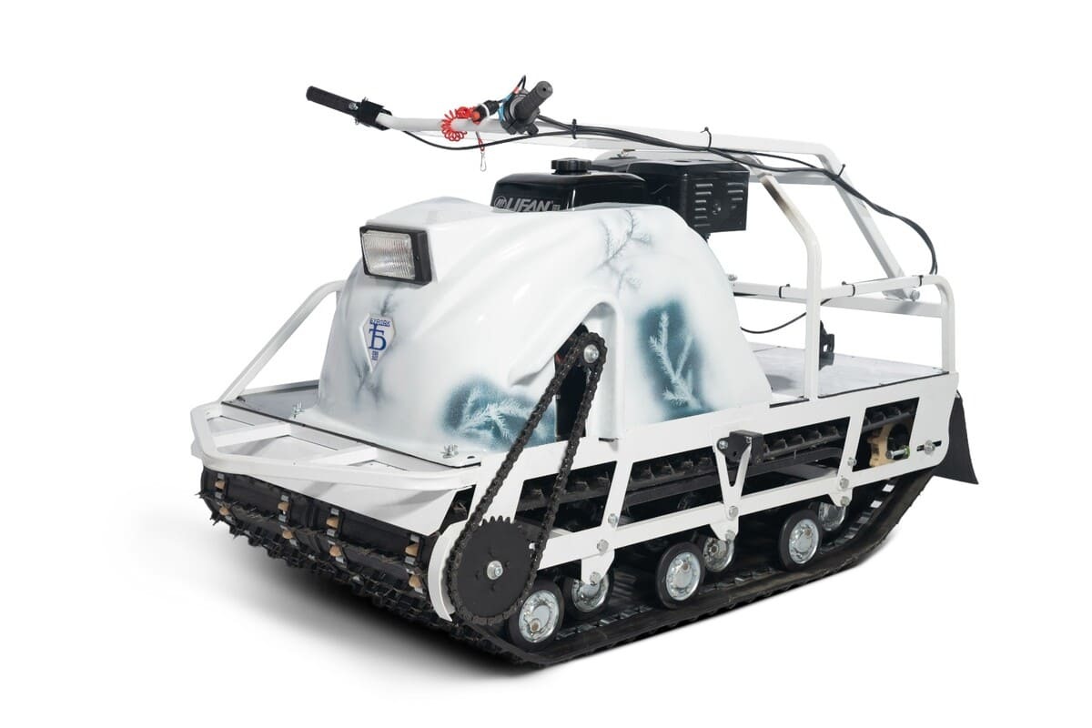 Мотобуксировщик Бурлак-М ПАТРИОТ на катковой подвеске. Две гусеницы шириной 38см каждая обеспечивают высокую проходимость по любым видам покрытий. Данная модель управляется так же, как и любой классический мотобуксировщик, - при помощи складного руля, стоя либо сидя в волокушах или прицепе. Таким образом, нет необходимости ставить данную технику на учет и получать права на управление. На Бурлаке ПАТРИОТ установлены проверенная временем трансмиссия с вариатором Сафари.