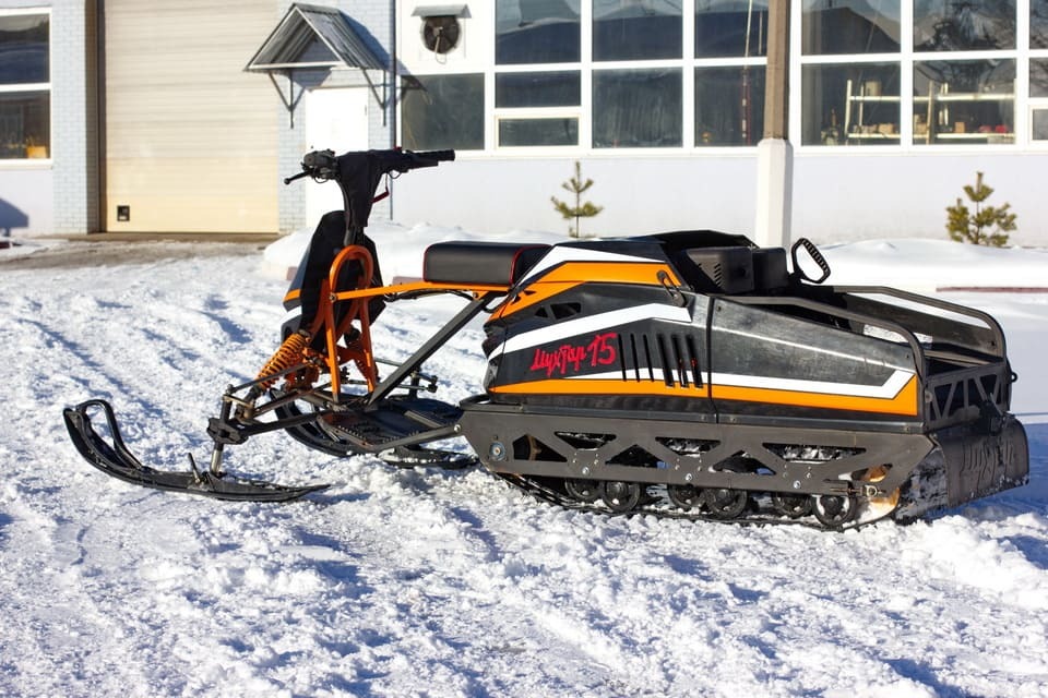 Мотособака весит 100 кг, а размер ее составляет 155 см в длину, 62 см в ширину и 78 см в высоту. Благодаря своей легкости и компактности, мотобуксировщик способен маневрировать и проходить по рыхлой и мягкой почве. К тому же мотобукс оснащен катковой подвеской, которая сглаживает ход, обеспечивает устойчивость на неровной поверхности, смягчает удары и вибрации от дороги.