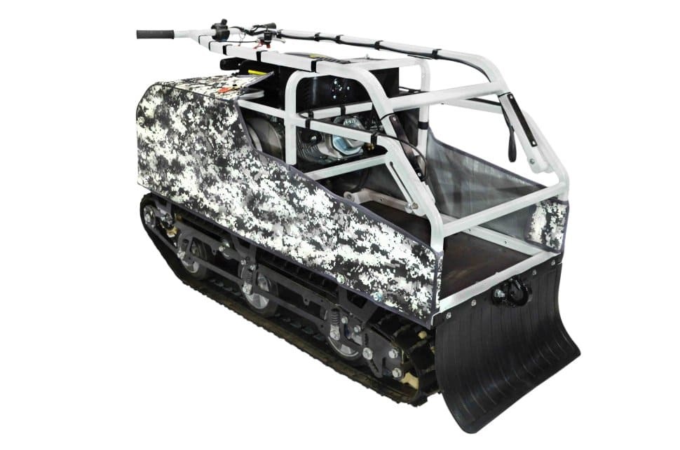 Мотособака весит 115 кг, а размер ее составляет 145 см в длину, 58 см в ширину и 84 см в высоту. Благодаря своей легкости и компактности, мотобуксировщик способен маневрировать и проходить по рыхлой и мягкой почве. К тому же мотобукс оснащен катковой подвеской, которая сглаживает ход, обеспечивает устойчивость на неровной поверхности, смягчает удары и вибрации от дороги.