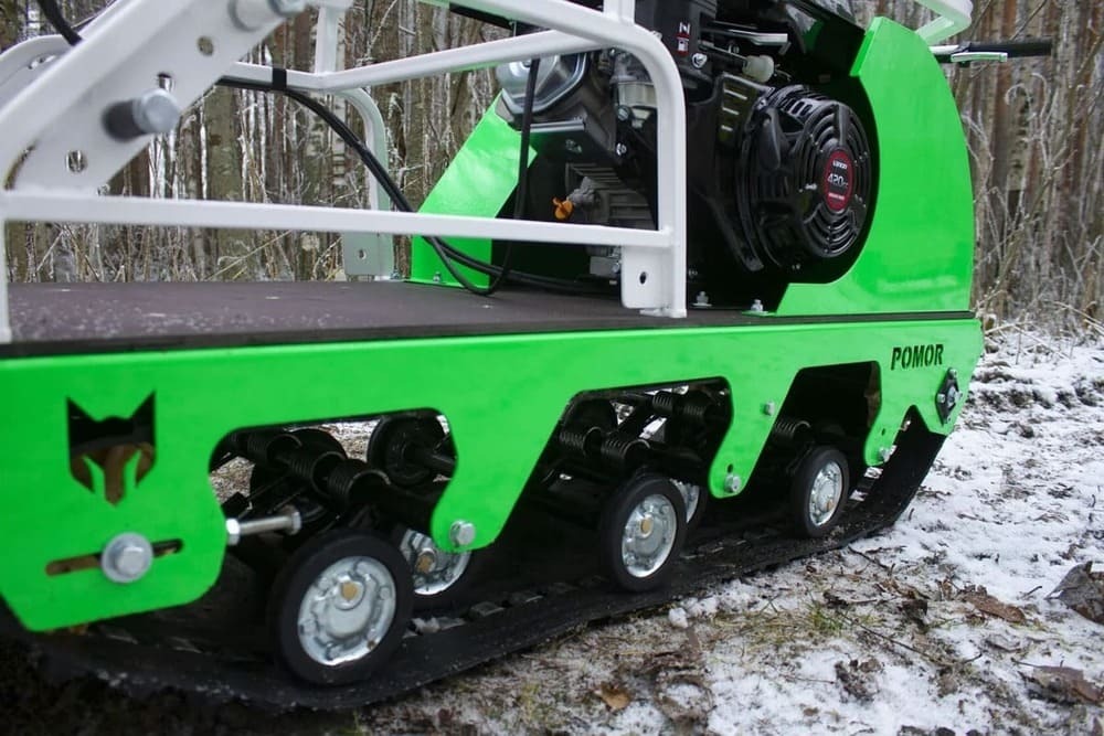 Мотобуксировщик Pomor X-500 оснащен мощным бензиновым двигателем с воздушным охлаждением, который обладает мощностью 15 л.с. Эта надежная силовая установка обеспечивает отличную производительность и экономичность, что позволяет использовать устройство в различных условиях. Двигатель легко запускается благодаря ручному стартеру и обеспечивает стабильную работу даже при низких температурах, что делает его идеальным для зимних поездок.