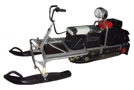Мотобуксировщики "Разгуляй" удобны в управлении благодаря удачному расположению всех кнопок и переключателей под рукой водителя. Водительское двухместное сиденье в базовой комплектации оснащено задней пассажирской спинкой и имеет доступное багажное отделение для перевозки аксессуаров. Компоновка снегохода традиционная – сзади расположен двигатель, спереди – водитель.