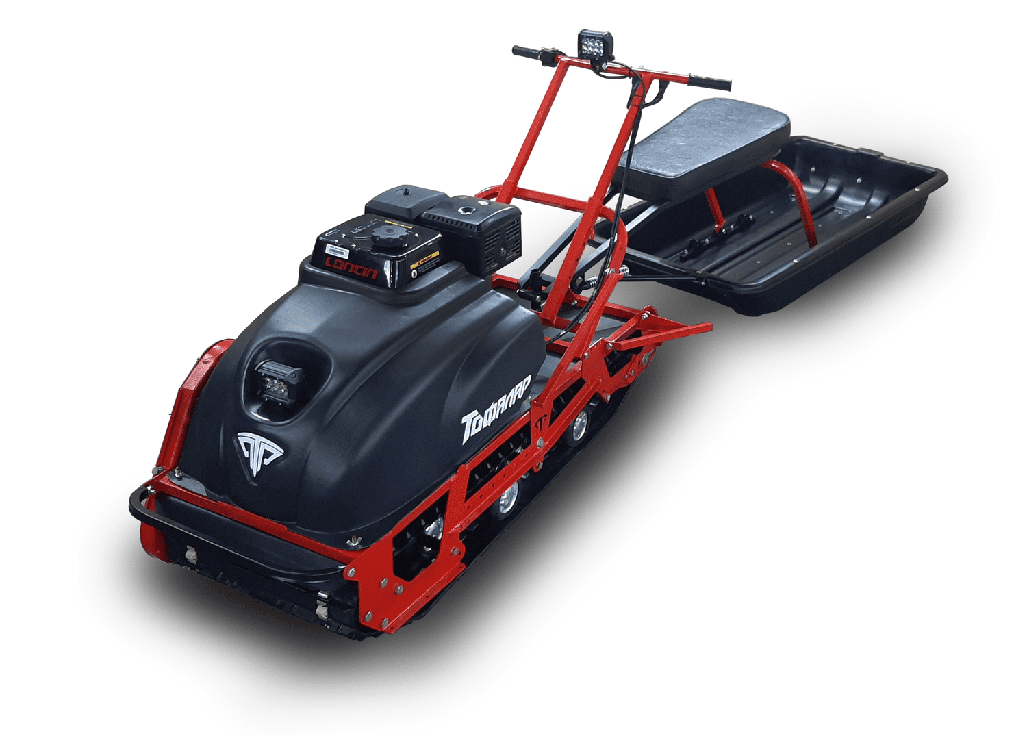 В конструкции мотовездехода используется цельная резиновая гусеница шириной 500 мм. Гусеница в сочетании с катковой подвеской способна проходить спокойно по льду и даже по территории без снега.