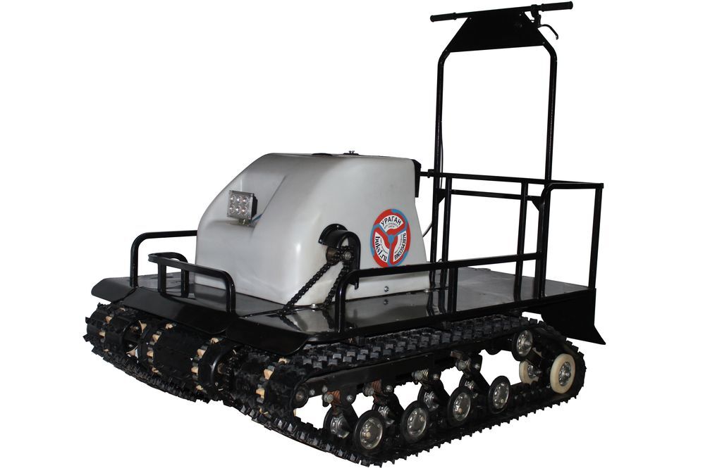 В конструкции мотовездехода используется цельная резиновая гусеница шириной 500 мм. Увеличенная площадь опоры гусеницы улучшает тяговые характеристики, проходимость и устойчивость буксировщика. Мотобукс оснащен специальной системой очистки гусеницы, благодаря которой не скапливается снег внутри и не увеличивает общего груза на транспорте.