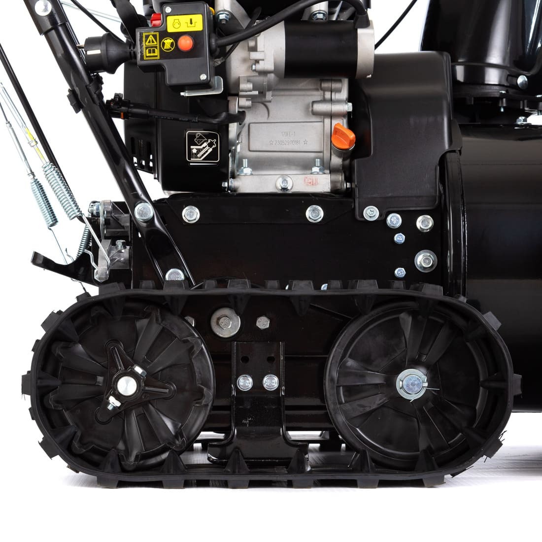 Зубчатая насечка шнека, усиленного ребрами жёсткости, успешно раскалывает лёд. Утолщенная крыльчатка выброса лопаточного типа позволяет отбрасывать снег до 12 метров. Самоходное шасси на колёсной и гусеничной базе снижает нагрузку на оператора и позволяет преодолевать небольшие уклоны.