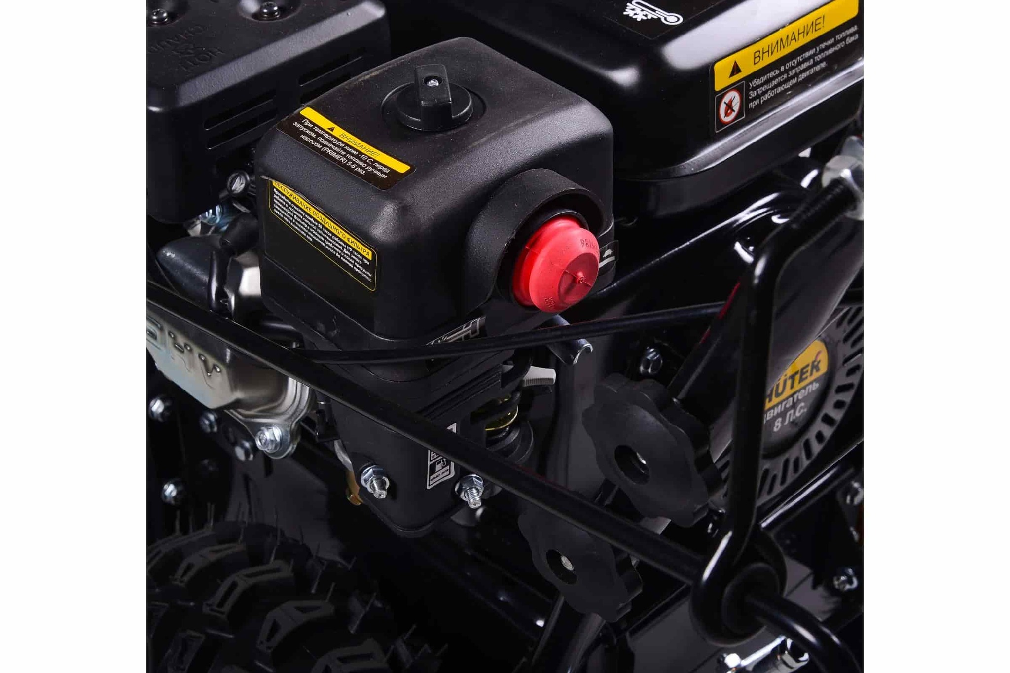 В центре конструкции Хутер расположен бензиновый двигатель внутреннего сгорания с воздушным охлаждением. Это одноцилиндровый четырехтактный двигатель, максимальная мощность которого достигает 8 л.с. Запуск двигателя осуществляется с помощью удобного электростартера, работающего от бытовой электрической сети 220 Вольт. Топливо заливается в бензобак объемом 3,6 литра, который находится рядом с двигателем, обеспечивая простоту заправки.