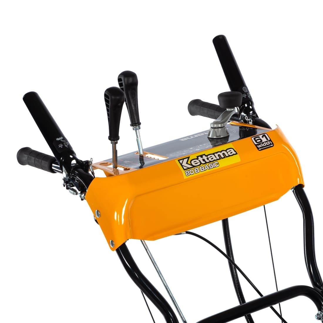 Эта модель способна справляться со снегом плотностью до 400 кг/м3 с производительностью до 4 т/ч. Этому способствует достаточно высокая мощность двигателя в 7 л. с. при небольшой ширине уборки в 610 мм. Kettama 80B Basic объединяет удобство управления и достаточно высокую рабочую ресурсность. Kettama 60B имеет возможность управления одной рукой. Это становится возможным благодаря одновременной фиксации рычагов движения колёс и шнека. Учитывая, что рычаг управления дефлектором выброса снега находится на панели оператора, уборка снега становится очень быстрой и удобной.