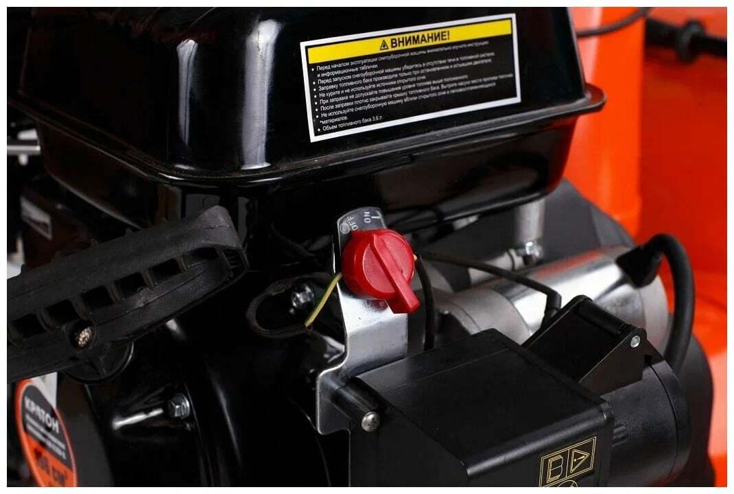 Снегоуборщик Кратон оснащен бензиновым двигателем мощностью 6,5 л.с. и объемом 196 кубов, защищенным от сильных морозов. Мотор отличается воздушным охлаждением и объемом бака 3,6 литров, которого хватит до 1-го часа работы. Также обладает 6 передачами — 5 вперед и 1 назад, так что вы сможете подобрать оптимальный режим для определенной ситуации.