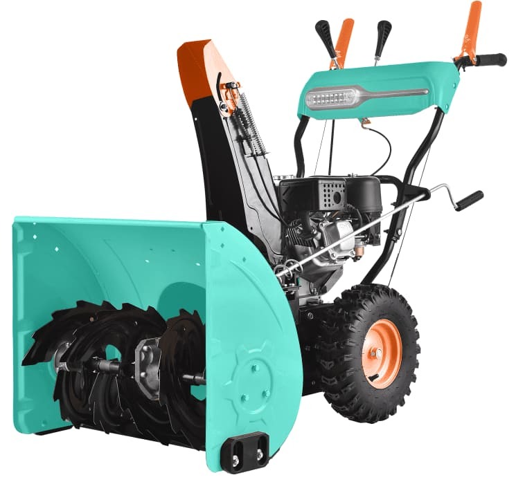 При необходимости, пользователь может также осуществлять запуск и с помощью ручного стартера. Высокая производительность машины обеспечивается не только мощным двигателем, но и продуманной конструкцией забора снега – этому способствует использование мощных агрессивных шнеков большого диаметра (31 см), позволяющих легко справляться даже с плотным слежавшимся снегом и настом, а также применение вместительного снегозагребного ковша, гарантирующего внушительную, одну из лучших в классе, ширину захвата в 61 см и возможность убирать сугробы до полуметра высотой. Снегоуборщик оснащен надежным металлическим выпускным желобом, с регулировкой по направлению выброса. Поворот желоба осуществляется дистанционно, посредством специального рычага на панели. Кроме того, предусмотрена возможность настройки угла выброса, благодаря которой регулируется необходимое расстояние выброса снежной массы. Максимальная дальность достигает 11 метров. Удобство эксплуатации в сумерках и темное время суток обеспечивает мощная LED фара – в условиях короткого зимнего дня ее наличие является важной составляющей эффективной работы. Маневренность и проходимость машины обеспечивают штатные широкие пневматические шины с глубоким протектором.