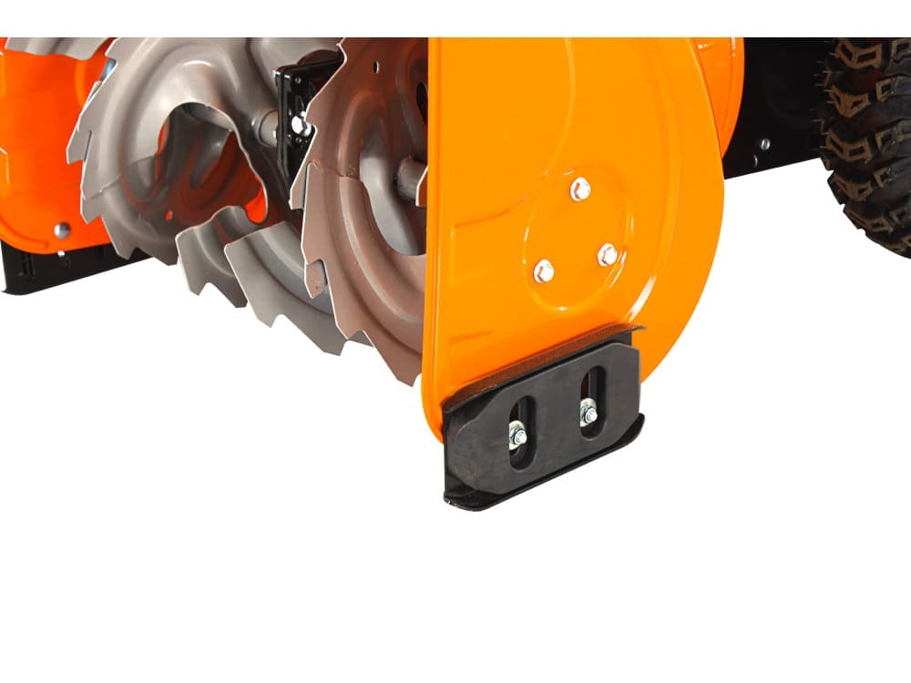 Рабочая ширина модели составляет 61 см, что позволяет легко обслуживать стандартные дорожки. Двухступенчатый металлический ковш захватывает сугробы высотой до 51 см. Собранный снег отбрасывается по стальному желобу на расстояние до 11 метров. Оператору доступно управление одной рукой – 89-килограммовая техника остается послушной и легко маневрирует на участке. Опорные лыжи из металла и пластика обеспечивают легкое скольжение техники для перемещения на любой территории. Управление углом наклона желоба и дальностью выброса осуществляется с помощью блока на передней панели машины.