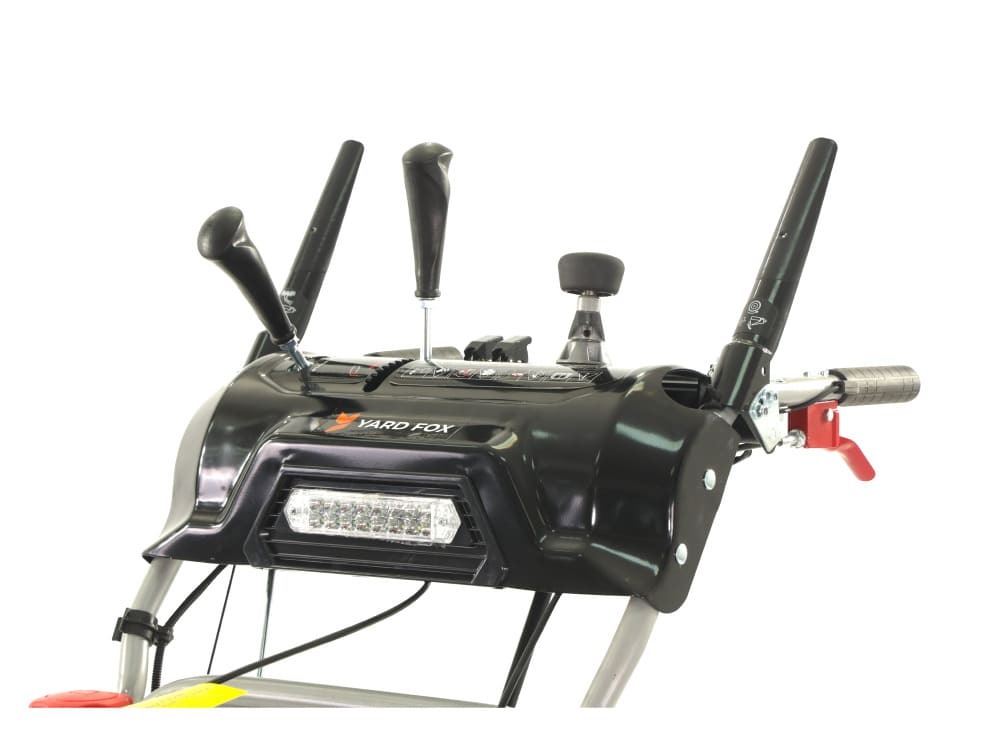Управление углом желоба и дальностью выброса происходит с панели оператора. Вес в 115 кг не мешает YARD FOX 7654E оставаться ловким и маневренным. Опорные лыжи обеспечивают легкое скольжение техники, при этом пользователю доступно управление одной рукой. Топливный бак объемом 3,2 литров обеспечивает эффективную очистку участка без дозаправки. Подогрев рукояток и яркая фара делают использование снегоуборщика комфортным и безопасным.